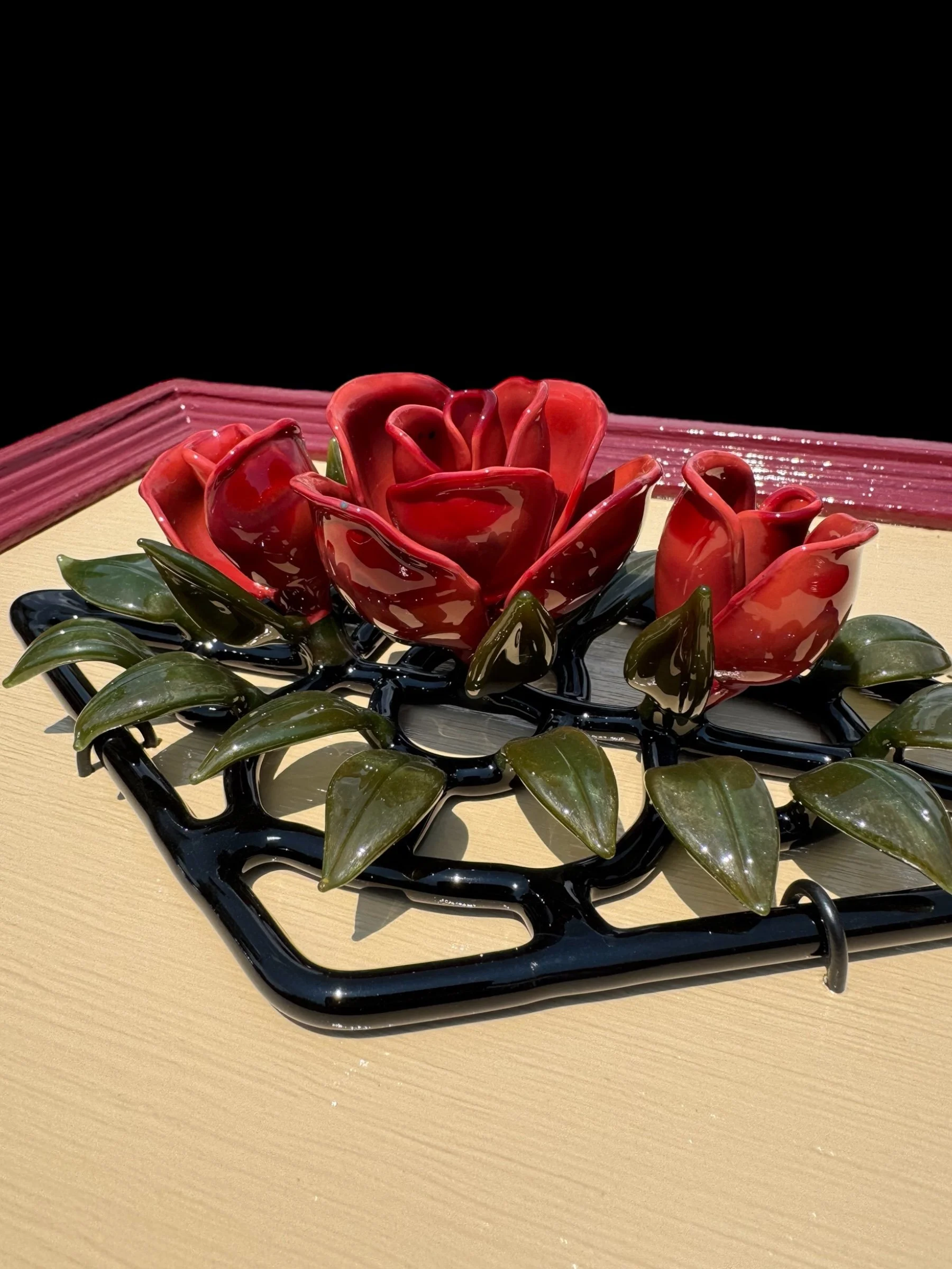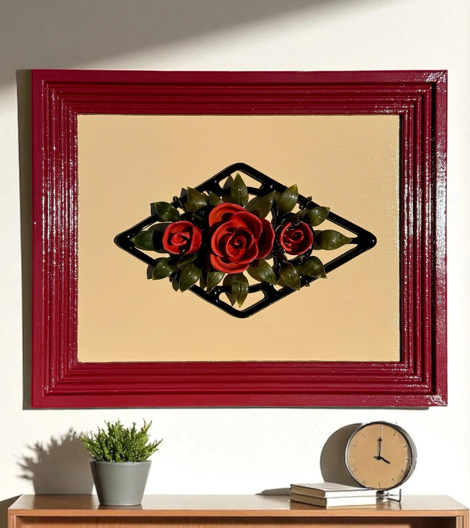 This borosilicate glass sculpture features three lifelike red roses delicately budding from a geometric bed of glass leaves. The clean modern aspects of glass mixed with the hand painted wood frame blend to give this piece a wonderfully soft and welcoming feel. Each element is meticulously hand-formed using traditional lampworking techniques—shaping molten glass directly with flame and skilled hands, no molds or large machinery are used—ensuring every petal is truly one of a kind. By utilizing modern borosilicate glass, known for its clarity and strength, I am able to push the boundaries of traditional glass art, achieving a level of lifelike realism that captures the fragile beauty of nature. This work explores themes of growth and transformation, inviting viewers to appreciate the intersection of craft and organic form through roses that are always blooming.